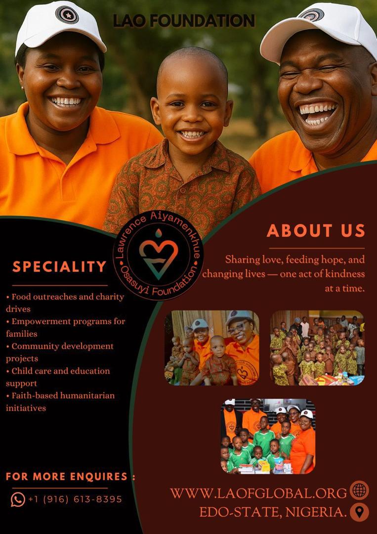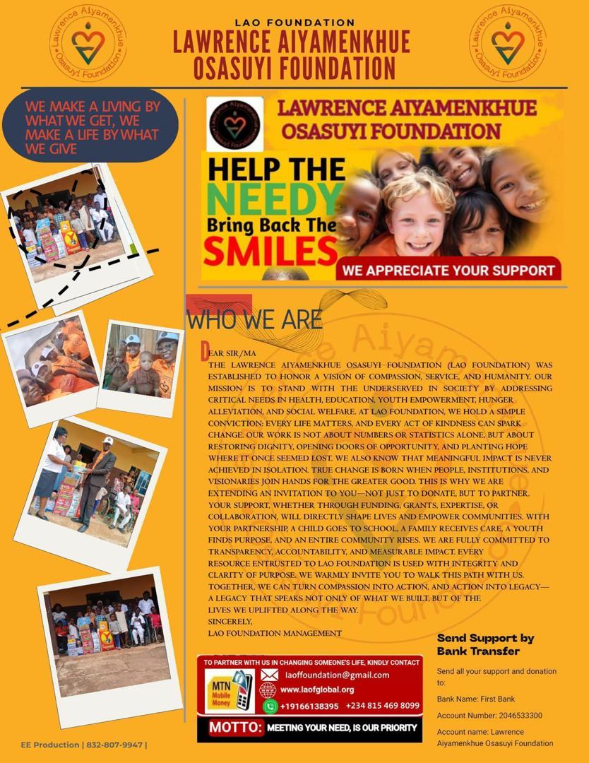 Lawrence Aiyamenkhue Osasuyi Foundation was born out of a deep-rooted passion for social justice, compassion, and the preservation of human dignity. Founded by Mrs. Obaseki Betty-Isoken, the Foundation was established in response to the visible gaps faced by vulnerable individuals and communities who are often overlooked and underserved. What began as a personal conviction has grown into a structured commitment to creating meaningful and lasting impact.